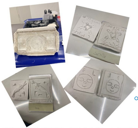 Aber das Beste kam danach: Die Klasse durfte selbst Hand anlegen! Mit Modelliermasse, Gießgips und jeder Menge Spaß lernten die Kinder das Positiv-Negativ-Verfahren kennen. Mit kleinen Werkzeugen und großen Ideen wurden eigene Reliefs gestaltet – ob ein Löwe, der in Hai, oder etwas fantasievolles. Alles war möglich, und am Ende entstanden echte kleine Kunstwerke, die die Kinder stolz mit nach Hause nahmen.