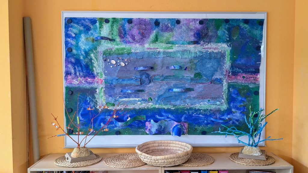 In unserem Atelier entstehen wunderbare Kunstwerke wie dieses farbenprächtige Bild, das die Fantasie und den kreativen Ausdruck unserer Schülerinnen und Schüler widerspiegelt. Mit viel Freude und Experimentiergeist erschaffen die Kinder hier ihre eigenen kleinen Meisterwerke in den verschiedensten Techniken und Farben. Das Atelier ist ein Ort, wo Kreativität keine Grenzen kennt und jedes Kind seine künstlerische Seite entdecken kann.