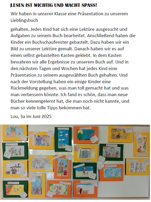 Die Klasse 4a hat in den letzten Wochen spannende Buchpräsentationen durchgeführt. Jedes Kind stellte sein Lieblingsbuch auf kreative Weise vor – entweder in einem gestalteten Karton, auf einem Plakat oder in Form einer Buchrolle. Die Schülerinnen und Schüler haben sich viel Mühe gegeben, ihre Bücher anschaulich zu präsentieren. Mit Bildern, Zitaten und spannenden Zusammenfassungen haben sie ihre Klassenkameraden begeistert und vielleicht sogar für das eine oder andere neue Lieblingsbuch inspiriert.