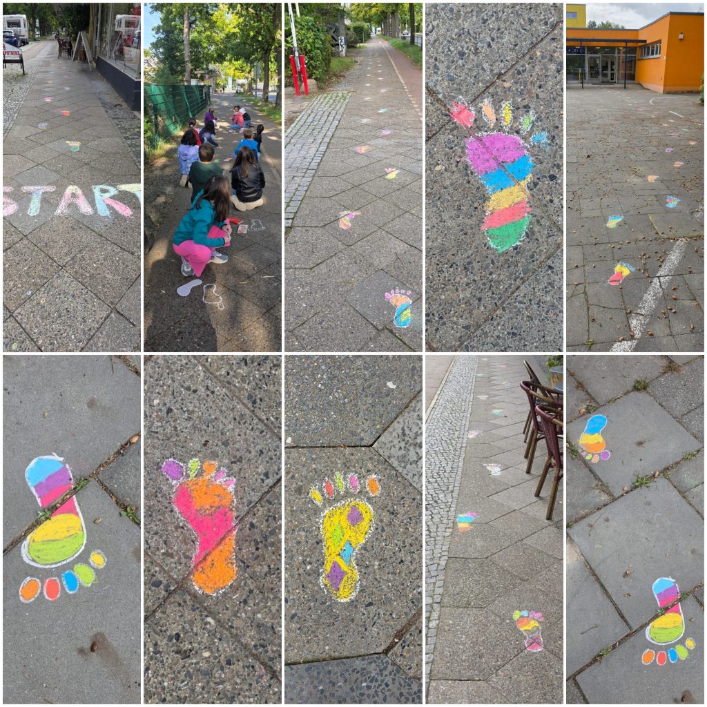 Besonders kreativ war die Grundschule am Buschgraben: Unsere Schüler bereiteten sich auf den besonderen Tag vor, indem sie mit bunten Kreide-Fußabdrücken auf den Gehwegen der Umgebung die Strecke zur Schule verschönerten. Diese farbenfrohen Markierungen sollten den anderen Schülern den Weg weisen und sie gleichzeitig dazu anregen, ebenfalls zu Fuß zu kommen.