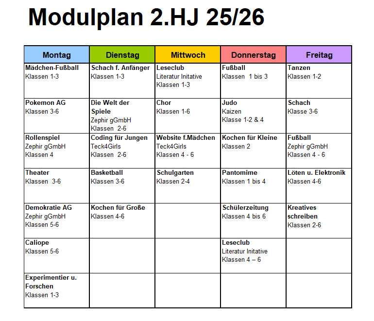Im 2. Halbjahr 2025/26 bietet die Grundschule am Buschgraben vielfältige FlexModule in der Zeit zwischen 14.30 Uhr und 16.00 Uhr. Die Teilnahme an den FlexModulen ist freiwillig, aber verbindlich für das jeweilige Halbjahr.